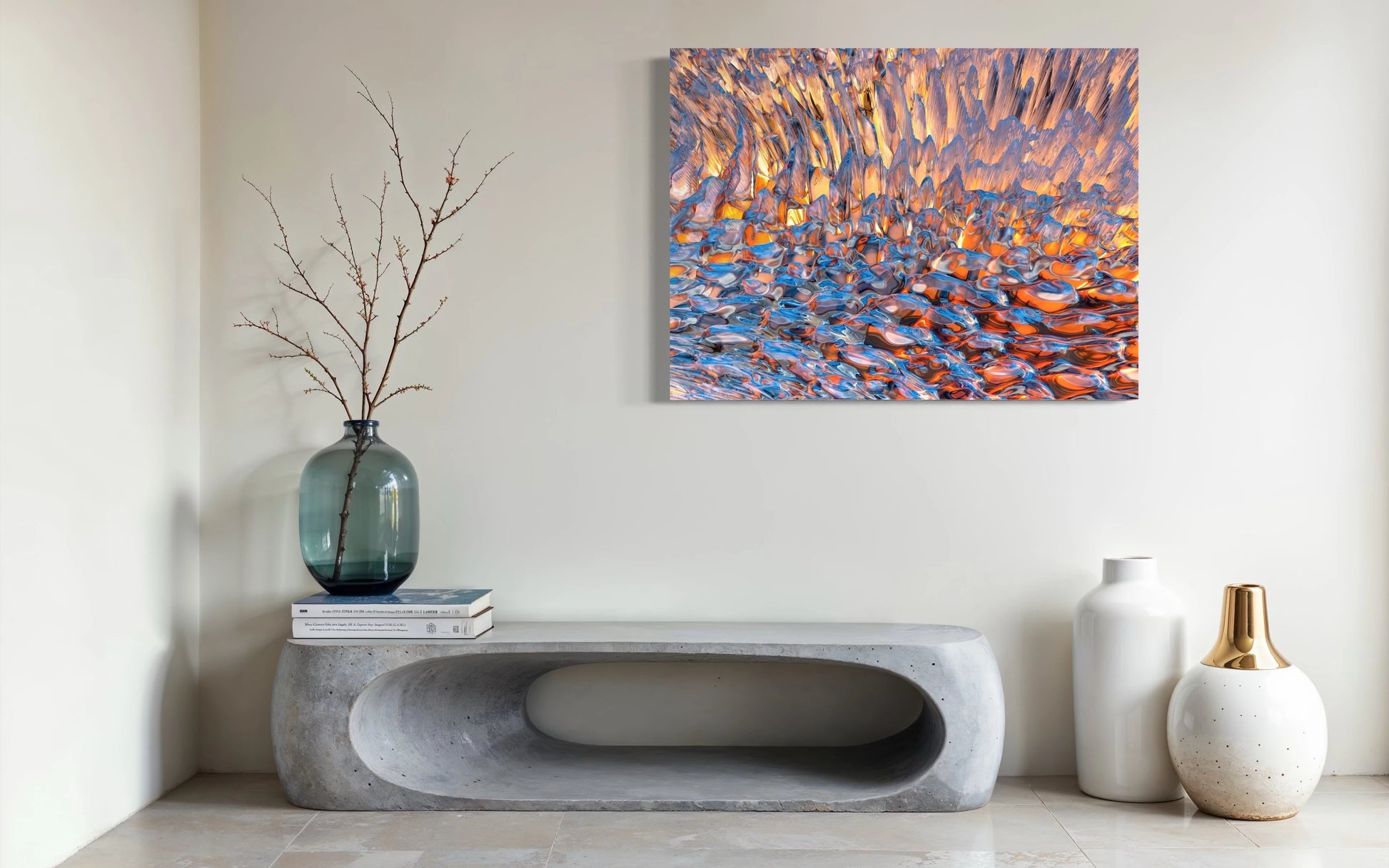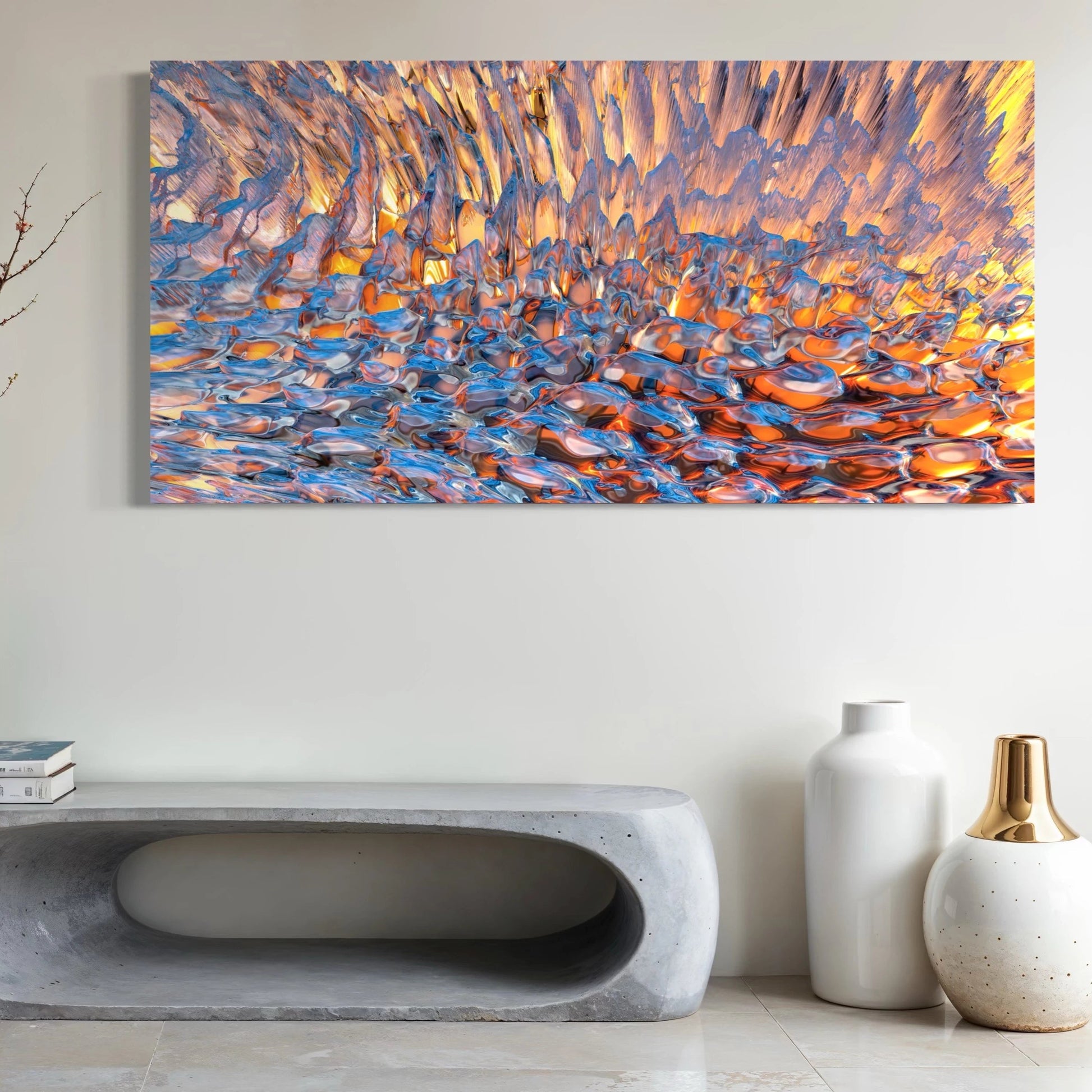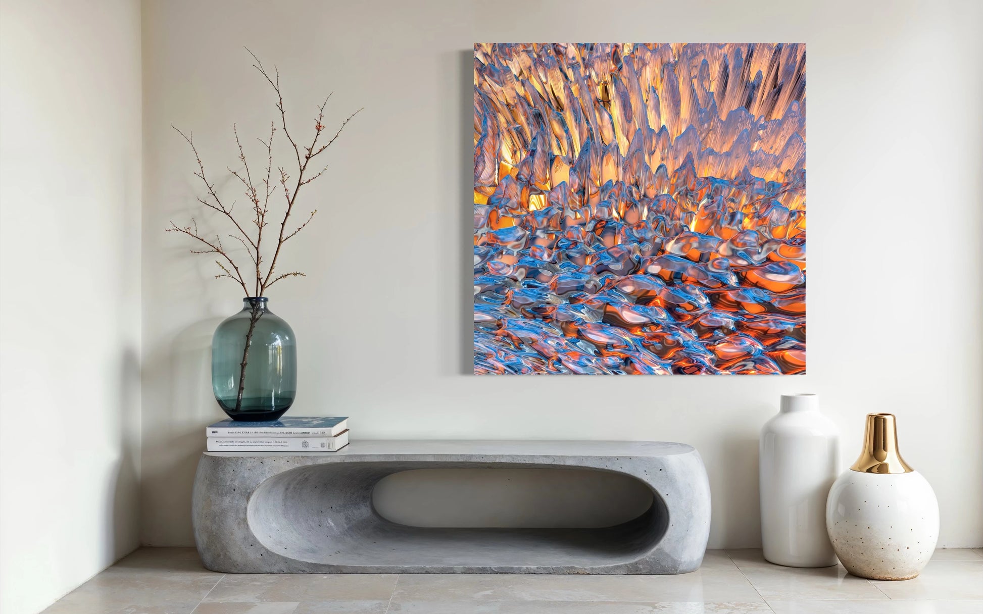 Accendi il tuo spazio con "Inferno Fusion", un'opera d'arte astratta che fonde tonalità ardenti di arancione con sfumature fresche di blu, creando un affascinante gioco di colori e texture. Questa straordinaria opera cattura l'intensità dell'energia fusa e del movimento fluido, rendendola il pezzo ideale per ambienti contemporanei.