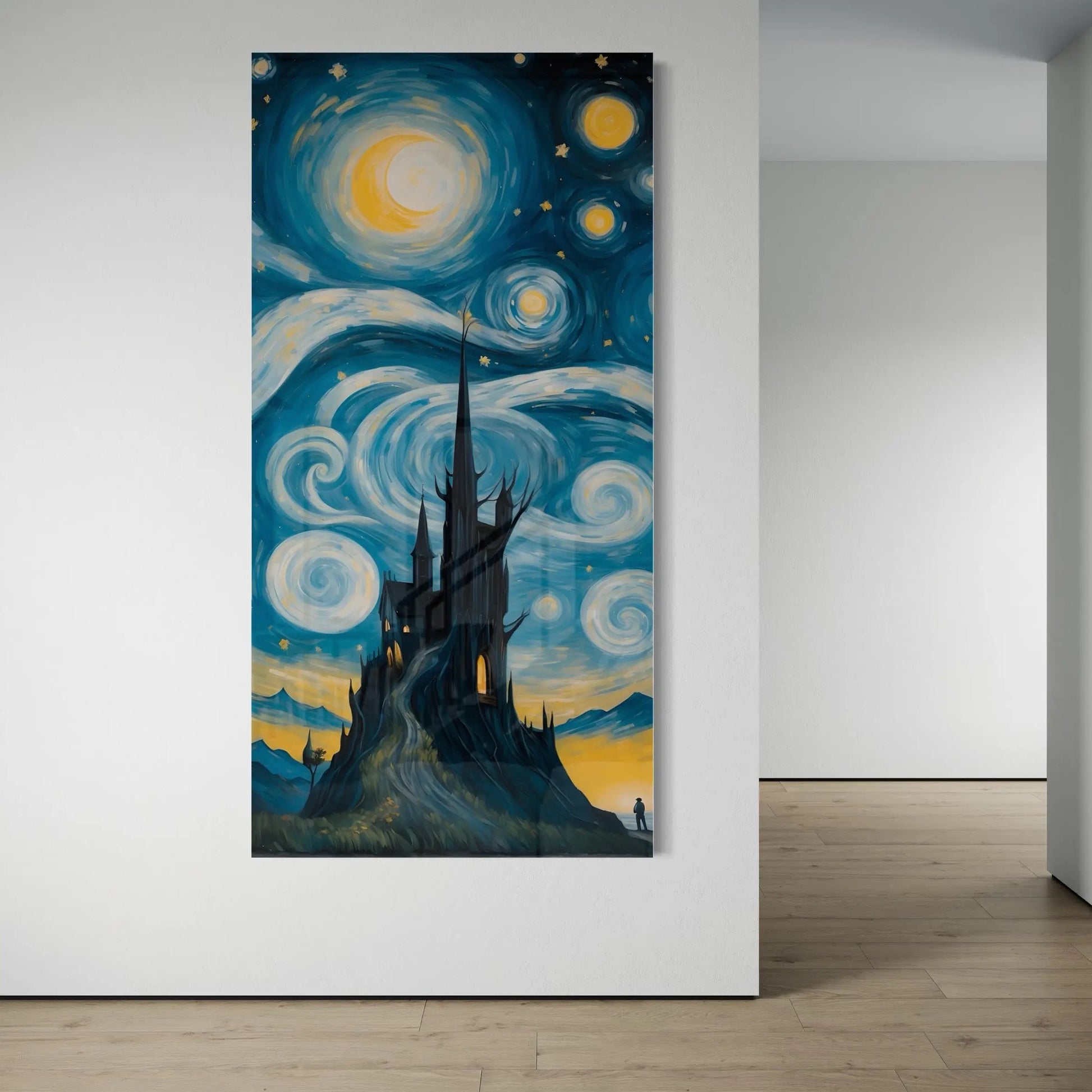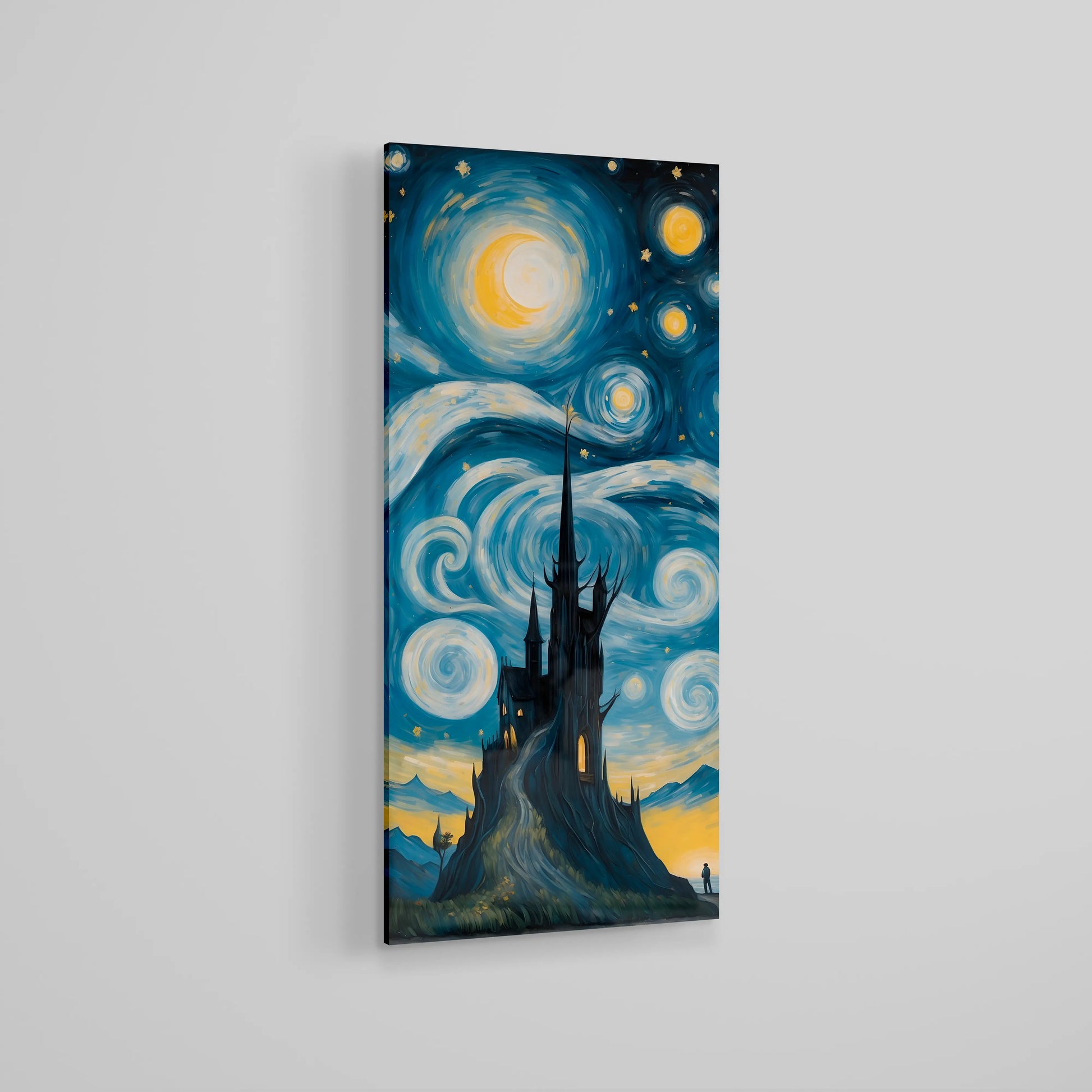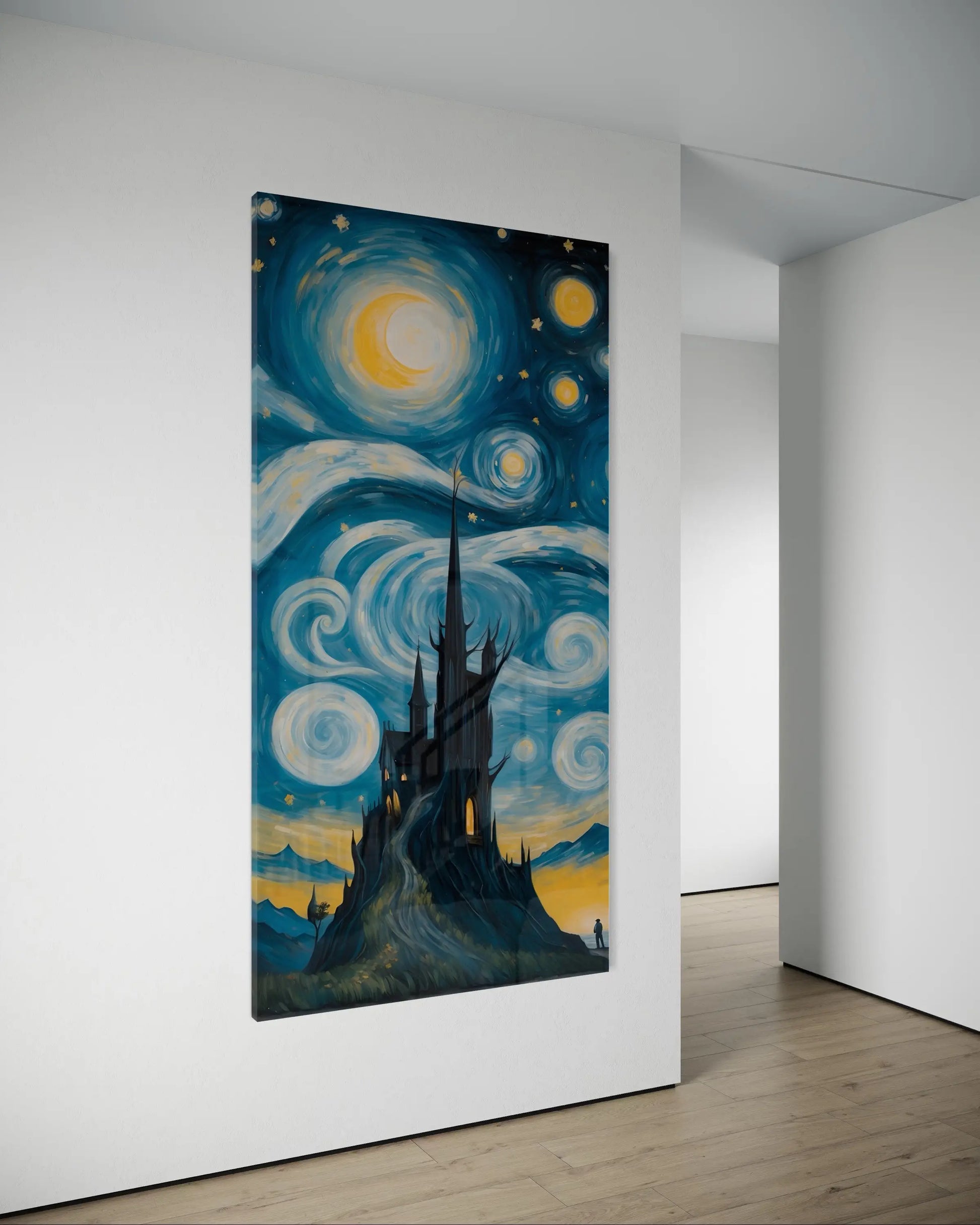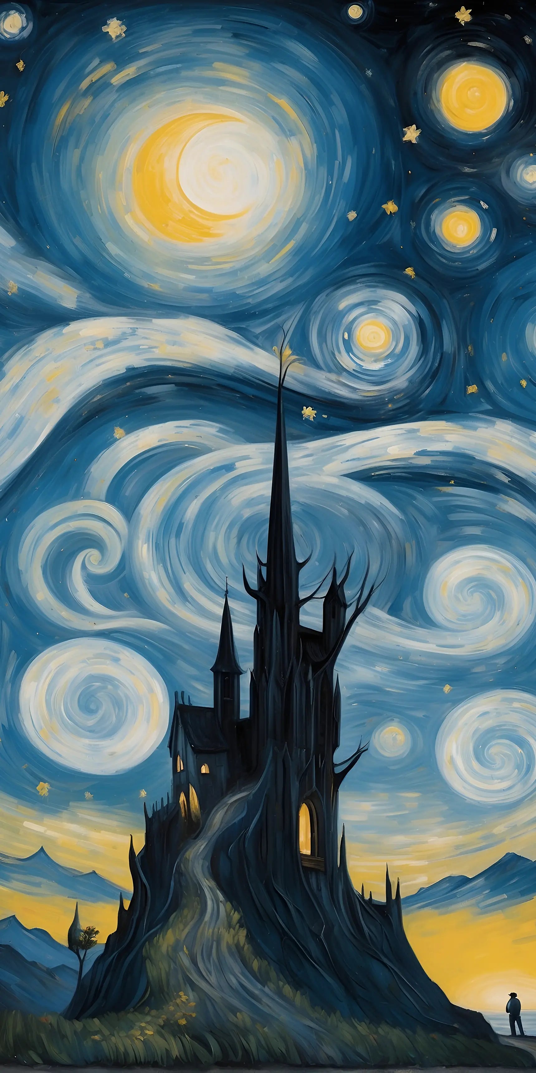 Immergiti in una fusione onirica tra la celebre Notte stellata di Van Gogh e un incantevole castello gotico, eretto su una collina mistica. Questa straordinaria opera d'arte digitale cattura un cielo celeste che vortica, la luce della luna che brilla e la silhouette di una torre che si erge, evocando un senso di mistero e meraviglia. Un pezzo perfetto per gli amanti della fantasia, del surrealismo e dell'arte senza tempo.